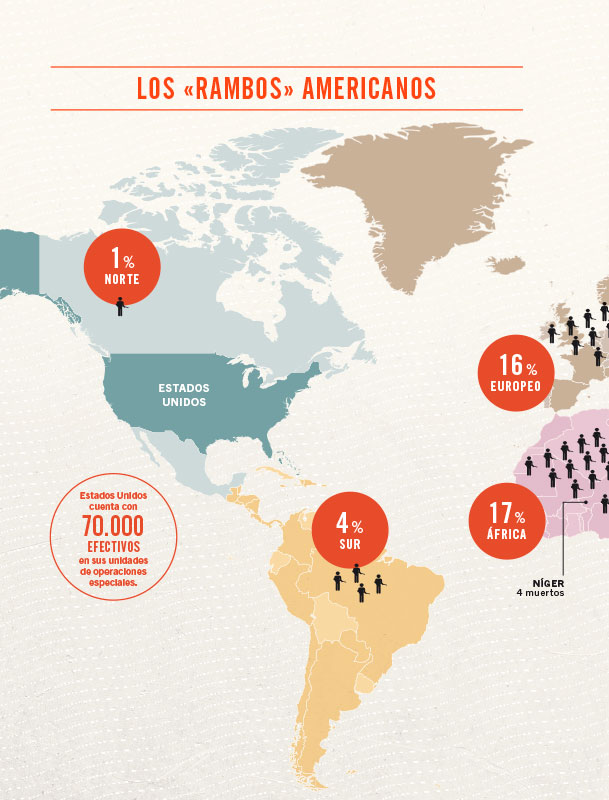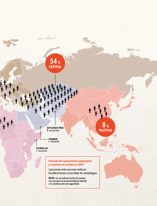 «Commandos Without Borders»,1 un artículo publicado en Toward Freedom a finales de julio de 2018, reveló que en 2017 las unidades de operaciones especiales de Estados Unidos realizaron misiones diversas en 149 países, lo que supone el 75 % del total del planeta, un ejemplo de la creciente importancia del uso de estas fuerzas. Además, en los últimos cinco años, fuerzas especiales norteamericanas como los Boinas Verdes o los Navy SEAL, amparadas en el texto legal conocido como la Sección 127e, efectuaron operaciones de reconocimiento, combate y acción directa en Camerún, Kenia, Libia, Mali, Mauritania, Níger, Somalia y Túnez. •