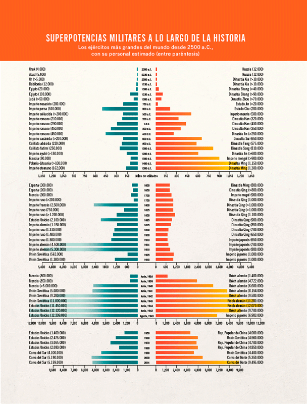 Aunque la configuración y el despliegue de los ejércitos han cambiado a lo largo de la historia, su relevancia sigue presente. Martin Vargic, diseñador gráfico de nacionalidad eslovaca, elaboró en el año 2014 una serie de infografías5 en las que muestra cómo el tamaño de los ejércitos creció durante un tiempo y después disminuyó, a medida que las guerras convencionales entre Estados fueron reduciéndose y, paralelamente, los avances tecnológicos incrementaron su importancia en detrimento de los medios humanos. Los gráficos ofrecen una visión global de la evolución de las potencialidades militares, los equilibrios de poder entre bloques antagónicos y la determinante influencia que ha tenido la capacidad bélica para convertir a algunos países en superpotencia. Arrojan también datos curiosos: en 1950 el número de efectivos de las Fuerzas Armadas de Estados Unidos era muy similar al que poseía la dinastía Ming en China en torno al año 1500. •
