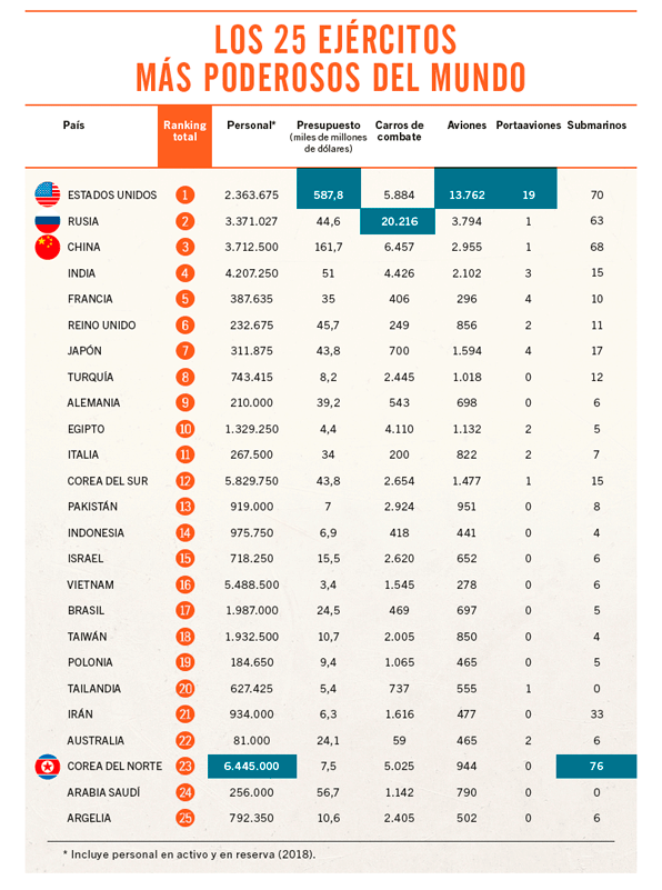 En cuanto a efectivos, al incluir el personal en situación de reserva, Estados Unidos tiene más de 2,4 millones de soldados, pero es superado por Corea del Norte (con un total de 6,4 millones de efectivos en un país de 25 millones de personas), Corea del Sur (5,8 millones de efectivos), Vietnam (5,5 millones), India (4,2 millones), China (3,7 millones) y Rusia (3,4 millones).6