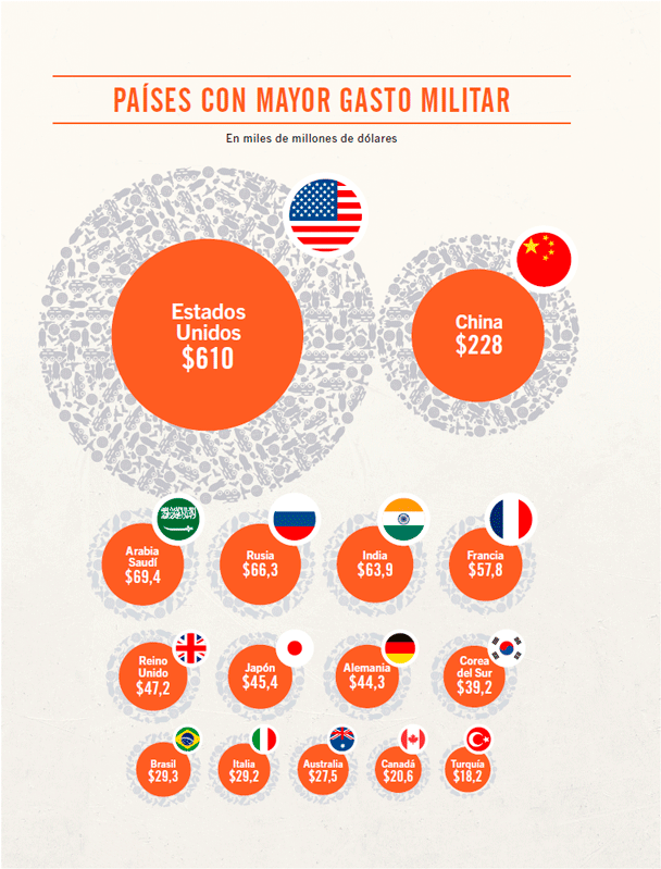 De acuerdo con el Instituto Internacional de Investigación para la Paz de Estocolmo (SIPRI), el gasto militar mundial en 2017 —que incluye la compra de armamento, así como sueldos, pensiones, equipo diverso, investigación y desarrollo— fue de 1.740.000 millones de dólares. Estados Unidos invirtió 610.000 millones, el 35 % del total del mundo, una cifra tres veces más alta que la de China (228.000 millones) y prácticamente 10 veces más que la de Rusia (66.300 millones; lo redujo un 20 % con respecto al año anterior). Además, el gasto estadounidense es mayor que el de los siguientes siete países juntos, puesto que China gastó el 13 % del total mundial; Arabia Saudí, 4 %; Rusia, 3,8 %; India, 3,7 %; Francia, 3,3 %; Reino Unido, 2,7 %, y Japón, 2,6 %.
