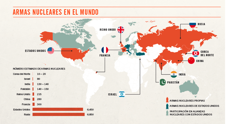 En torno al 92 % del total de armas nucleares se encuentran en manos de Estados Unidos y Rusia, con casi 7.000 cabezas cada uno. Los arsenales atómicos del resto de los países están a mucha distancia, pues se cuentan en cientos o decenas: Francia (300 cabezas), China (280), Reino Unido (215), Pakistán (entre 140 y 150), India (entre 130 y 140), Israel (80) y Corea del Norte (entre 10 y 20).