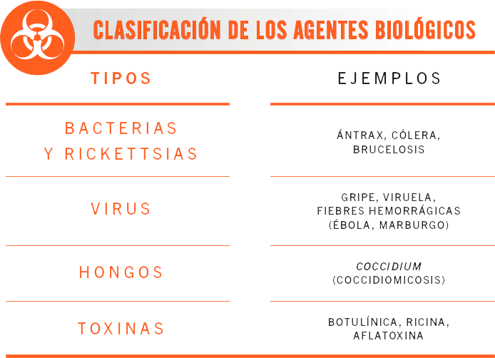 Dentro de este campo tan espeluznante se pueden incluir el ecoterrorismo (ataques contra el ecosistema, que afectarían al ser humano, animales, plantas y medio ambiente), el bioterrorismo (empleo de agentes biológicos), el agroterrorismo (introducción de una enfermedad en animales o plantas), las bioarmas (uso de patógenos como arma de guerra), las armas genéticas o etnobombas (organismos biológicos letales que son capaces de elegir a las víctimas por el origen étnico) y la guerra entomológica (utilización de insectos en ataques directos o como vectores para suministrar un agente biológico).14