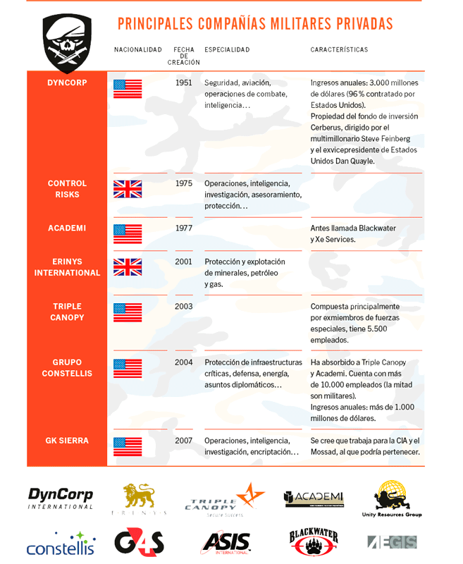 Sin duda, la CMP más conocida es Blackwater. Fundada por Erik Dean Prince, quien formó parte de los Navy SEAL —la principal fuerza de operaciones especiales de la Armada estadounidense—, esta empresa se dio a conocer en 2007, tras perpetrar la matanza de 17 civiles en la plaza Nisour de la capital iraquí. En 2009 adquirió el nombre Xe, y dos años después pasó a denominarse Academi, cuando ya se había desvinculado de su fundador.