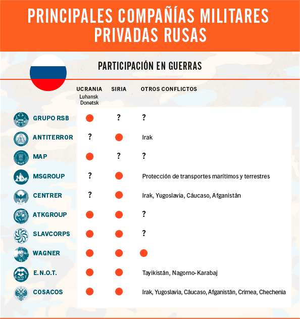 Actualmente las CMP están presentes en numerosos países, principalmente en los escenarios de conflicto. La mayoría de ellas son de capital anglosajón, con sede principal en Estados Unidos o Reino Unido. Sin embargo, en los últimos años se han fundado empresas de este tipo en otros países. Aunque el artículo 348 del Código Penal ruso prohíbe expresamente la figura del mercenario, se cree que a partir de 2011 Rusia empezó a plantearse la posibilidad de crear CMP para su empleo en el extranjero, como una forma de garantizar los intereses nacionales sin la participación directa del Estado. En realidad, el Kremlin no hacía más que replicar lo que hasta entonces habían hecho con profusión otros países, especialmente Estados Unidos. Además, se consideró que estas compañías podían acoger a los militares retirados, pues en ese momento los ministerios rusos de Defensa e Interior planeaban una reducción en sus plantillas.