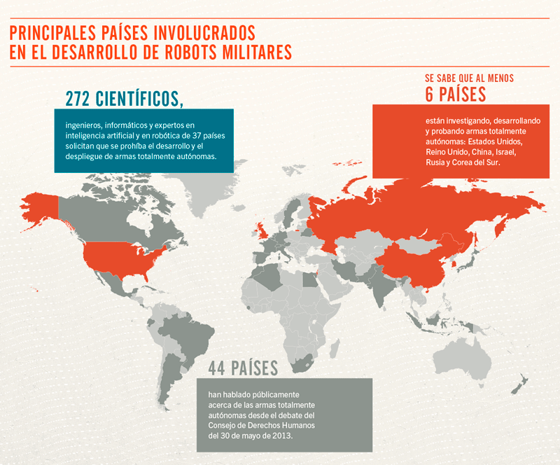 Se estima que, para el año 2020, el gasto mundial en robótica y servicios relacionados con la misma se situará en la nada desdeñable cifra de 188.000 millones de dólares. Fundamentalmente, Estados Unidos, Rusia, China e Israel son los países más avanzados y con el mayor número de investigaciones en este campo. Si siempre se ha dicho que la guerra es inhumana, en un futuro muy próximo simplemente será no humana, pues la llevarán a cabo robots. Pero que no nos quepa duda de que los seres humanos la seguiremos padeciendo. •