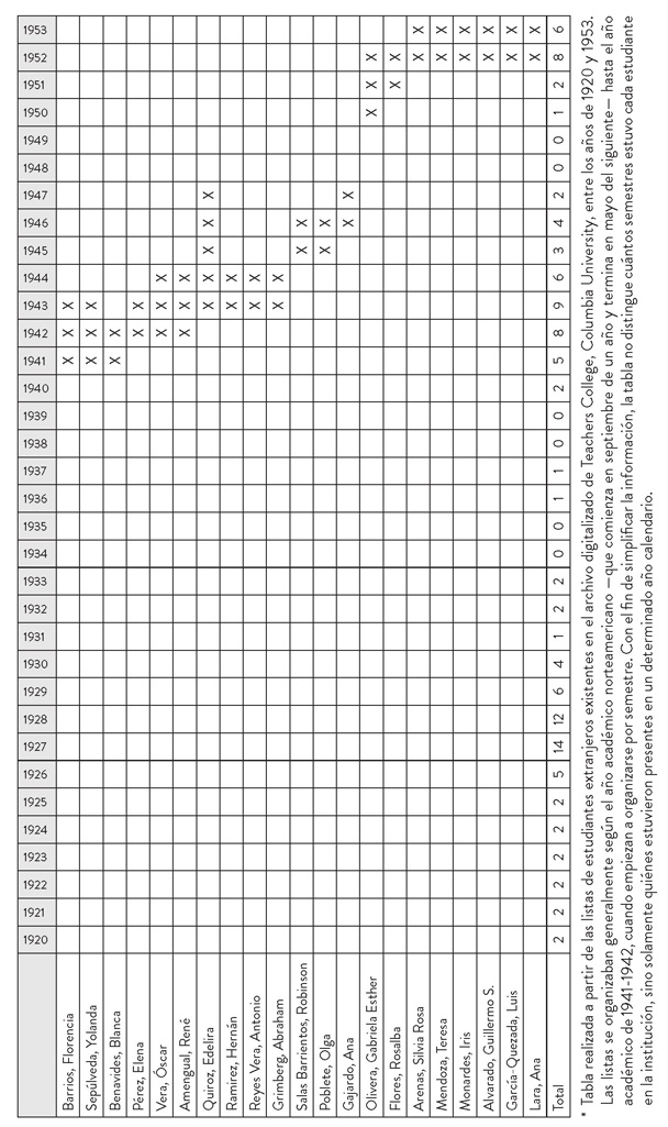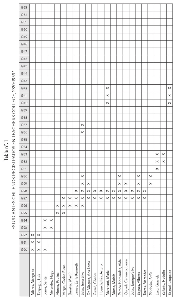 No fueron pocos los chilenos que llegaron hasta las aulas de la universidad neoyorkina. El semestre en que ingresó Salas, se encontraban también en la misma institución Earl Kenneth James, que estudiaba Sociología, y Corina Vargas y Martín Bunster, estudiando Psicología Educacional.34 En total, fueron once chilenos los que pasaron por Teachers College durante la estadía de Salas, como Arturo Huenchullán, que estudiaba Educación Rural y Civilizaciones Indígenas, los profesores Moisés Mussa y María Marchant, que hacían lo mismo en el programa de Educación Comparada, e incluso el hermano de Irma, Enrique Salas. Una revisión de los registros históricos de dicha institución demuestra que la conexión con Chile se extendió durante prácticamente todo el periodo estudiado. Como muestra la tabla n°. 1, entre 1920 y 1953 un total de cuarenta y cuatro ciudadanos chilenos recibieron formación de posgrado en dicha casa de estudios. Si bien su presencia en este lugar fue una constante —solo en seis de los treinta y cuatro años analizados no hubo ningún chileno estudiando allí—, sus momentos de mayor concentración ocurrieron entre 1927 y 1929, entre 1942 y 1944 y entre 1952 y 1953, coincidiendo con algunas de las principales reformas vividas por el sistema educativo chileno. Quienes llegaron después de 1939 no hallarían a Dewey ni a Torndike, pero no por ello dejaron de estar expuestos a sus ideas. En esos años el departamento de Fundaciones Sociales y Filosóficas del Teachers College estaba dirigido por Jesse Newlon, mientras que el de Fundaciones Psicológicas y Biológicas tenía a su cabeza a Arthur Gates, quien había llegado a la institución de la mano del mismo Torndike y a quienes muchos considerarían su sucesor.35