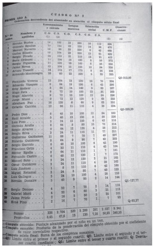 Según Charles Goodwin, los miembros de las distintas profesiones ejercen prácticas discursivas para articular eventos diversos dentro de los dominios propios de su escrutinio profesional, y de aquella forma los convierten en objetos de conocimiento sobre los cuales ejercer su experticia.60 Goodwin identifica tres de estas prácticas discursivas: codificar, que supone «transformar los fenómenos observados en los objetos de conocimiento que animan el discurso de una profesión»;61 destacar, que implica resaltar de alguna forma algunos de estos fenómenos en particular por sobre otros; y producir y articular representaciones materiales. Estas prácticas fueron también parte de la ‘visión profesional’ psicológica que se volvería dominante en el ámbito educativo chileno durante estos años. Quizás nada ilustra mejor esta teoría que los informes surgidos de las diversas mediciones mentales y pedagógicas aplicadas en las escuelas experimentales, y más tarde en las escuelas del resto del país.62 En 1939, por ejemplo, el Boletín de las Escuelas Experimentales informó sobre los avances realizados por la Escuela Experimental de Niños Salvador Sanfuentes en el proceso de «clasificación, redistribución, promoción y democión de los alumnos»; dichos avances fueron atribuidos a la aplicación de una serie de tests y escalas de medición.63 El artículo destacaba que la aplicación de una serie de tests y escalas de medición había «permitido clasificar rápidamente al alumnado de la escuela, controlar la altura inicial de los ramos instrumentales en cada niño y en cada curso […] además de posibilitar una visión de conjunto de cada uno de los cursos como unidad».64 Enfatizaba además que estos tests contenían «psicológicamente discriminadas las diferentes etapas del desarrollo del lenguaje, de los conceptos matemáticos y las adquisiciones fundamentales de la educación social».65 El informe derivado de estos, se acompañaba de dos gráficos que representaban los resultados de los distintos cursos de la escuela en los cuatro test aplicados (imágenes n°. 1 y 2), así como una tabla que presentaba los resultados de todos los estudiantes de un curso, ordenados de mayor al menor rendimiento (imagen n°. 3). El primer gráfico muestra el logro obtenido por cada curso en los test de razonamiento, cálculo, castellano y educación social, mientras que el segundo hacía lo mismo con el logro promedio obtenido a partir de todos.66 La tabla, por su parte, expresaba en valores numéricos el logro obtenido por cada estudiante, desagregado por test y ponderado a nivel de conjunto. Pero lo más importante no era la información que estos mecanismos entregaban sino el cómo se realizaban. Los resultados del test no decían nada realmente sobre lo que habían aprendido los estudiantes, sino que reflejaban su desempeño concreto en un actividad particular y situada en el tiempo —la de responder un test—, pero la lógica seguida por los educacionistas del periodo implicaba que el test era un instrumento científico y, responderlo, una suerte de experimento replicable, donde la variable ‘inteligencia’ determinaría que el estudiante hallara la respuesta correcta o no. Por medio del uso de columnas y términos numéricos comparables, los gráficos y la tabla codificaban luego los resultados de este acto particular, presentándolo como reflejo directo de la ‘inteligencia’y el ‘aprendizaje’de los estudiantes. Más importante aún, hacían de esta ‘inteligencia’ una realidad comparable entre individuos y grupos. Tablas como la presentada en la imagen n°. 3 permitían además destacar a individuos y subgrupos particulares, no solo a través del ordenamiento descendiente de los alumnos, sino por medio de la demarcación explícita de los límites entre los distintos quintiles que componían el grupo curso.