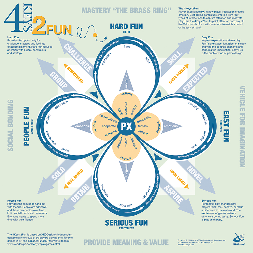 La psicóloga y diseñadora de juegos Nicole Lazzaro, que ha estudiado en The 4 Keys 2 Fun (2004) las emociones de los jugadores, describe cuatro tipos de diversión: