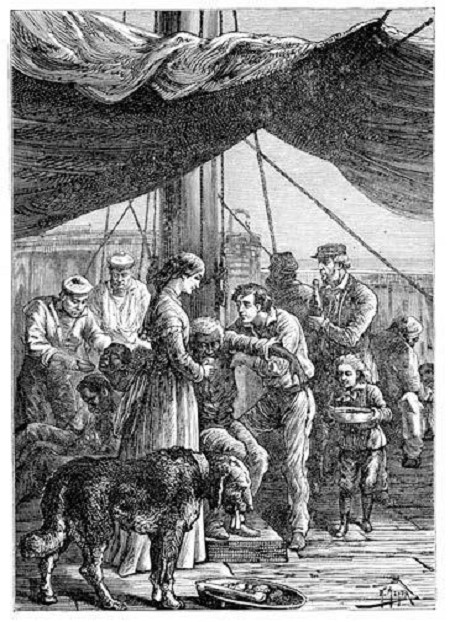 Durante los diez días que transcurrieron entre la colisión y el momento en que el Pilgrim llegó a la vista del buque naufragado, los cinco negros se habían alimentado con algunas provisiones que encontraron en la despensa de la cámara. Pero no habiendo podido penetrar en la gamusa, anegada enteramente, no habían podido apagar su sed con ninguna bebida espirituosa y habían sufrido cruelmente, porque los barriles de agua que llevaban amarrados en la cubierta se habían deshecho con el choque. Desde la víspera Tom y sus compañeros, torturados por la sed, habían perdido el conocimiento, y ya era tiempo de que el Pilgrim llegase.