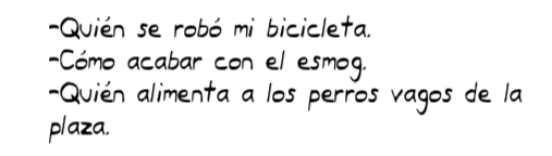 Me pasa que cuando no le encuentro respuesta a preguntas importantes –como cuando pienso ¿de dónde venimos?, ¿qué pasa después de la muerte?, ¿cómo es que soy la misma si cambio todo el tiempo?, ¿cómo es el infinito?, ¿de dónde vienen y a dónde van los sueños?, ¿cómo una célula sabe que le toca ser labio y a la de al lado, mejilla?– termino con tantas ideas dando vueltas por mi cabeza, que me mareo. Ahora tengo tantas preguntas sin responder, que me siento igual que cuando vamos con mis papás en auto por la Cuesta del Melón.