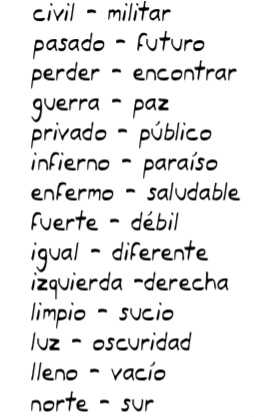 Hace poco llegué del cole y en vez de jugar, me tengo que aprender de memoria una lista laaarga de palabras para el dictado de mañana. ¿Por qué tendremos que hacer tantos dictados? ¿Tendrán que ver con la dictadura? También tengo que memorizar listas de sinónimos y antónimos. Pero ¿cómo se llamarán las palabras que están entre medio de los antónimos, por ejemplo, ni frío ni caliente, sino que tibio? Esta semana me tuve que aprender estos antónimos: