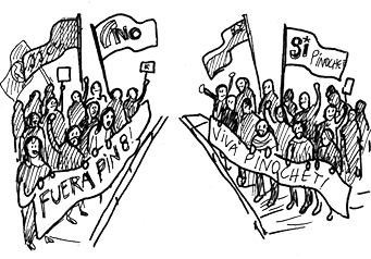 Así quedamos la Catalina, Teresa, Bruno y yo en el rincón del No y todo el resto, ¡del Sí! Entonces los del Sí nos rodearon en el patio y nos empezaron a decir “por culpa de ustedes los comunistas van a destruir el país” y cosas así. A mí me dio pena ver que mis amigos –con los que he sido compañera desde kinder como la Paulina o Mauricio– no dijeron nada. Cuando le conté a mi mamá, me dijo que en la última reunión de apoderados ellos también habían sido atacados porque fueron de los pocos papás del curso que se opusieron a la idea de hacer en la última kermesse un carro alegórico para apoyar al Gobierno. Me dijo que si las cosas seguían así, nos van a tener que cambiar de colegio.