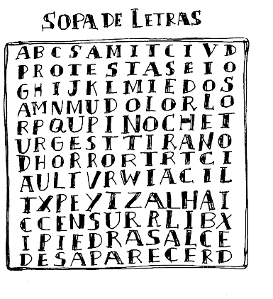 Esta es la última página en blanco que me queda por escribirte. Siento haberte contado tantas cosas terribles, desagradables, infelices. Siento mucho haberte llenado de todas las cosas miserables y violentas que fui descubriendo a mi alrededor. Pero no pude callar estos misterios que fuimos resolviendo. Quisiera haber escrito más sobre cosas hermosas, por ejemplo, que con Víctor hemos seguido escribiéndonos y seguimos siendo amigos aunque estemos tan lejos, que la Vero es de las personas que más quiero, que ya tengo algunas amigas en el colegio nuevo y que he seguido conversando con mi mamá. No te escribí estas cosas porque la verdad es que no me falta a quién contárselas. Lo que aún no puedo hablar con casi nadie, es sobre esta sopa de letras que esconde algunos de los significados de la dictadura que Los Cangrejos fuimos descubriendo: