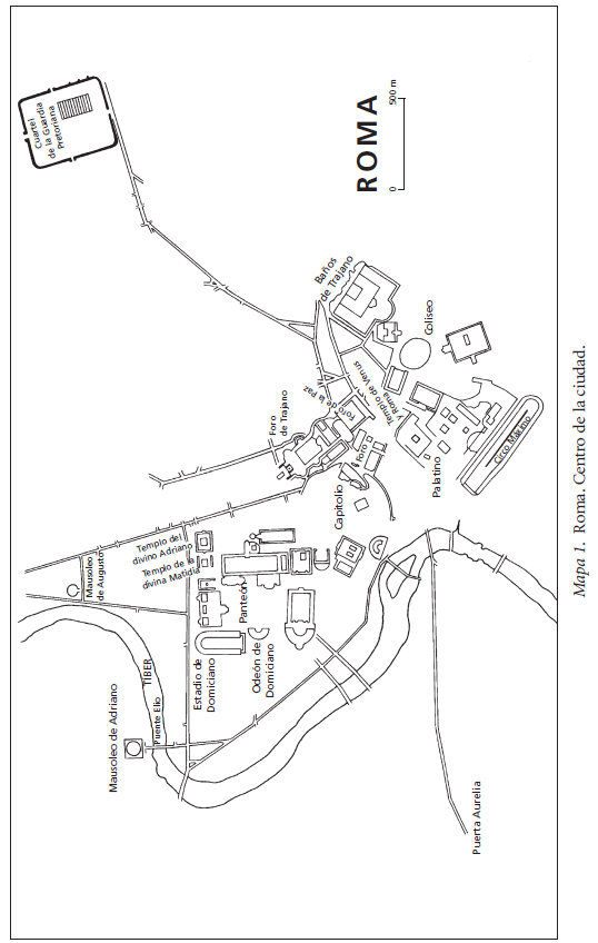 El nuevo estadio de Domiciano era solo una pequeña parte del grandioso plan constructivo acometido por él a lo largo de su reinado, continuación, en realidad, de lo que Nerón había puesto en marcha desde que inició la reconstrucción de la urbe tras el fuego del 64. Vespasiano y Tito habían llevado mucho más lejos el proyecto neroniano con el nuevo y extenso Foro de la Paz, los nuevos baños y templos y, por supuesto, el Coliseo. Tras el incendio del 80 había mucho que restaurar. Además de otros proyectos, Domiciano amplió y mejoró notablemente la residencia imperial del Palatino. El auge constructivo, que en el momento de la muerte de Domiciano tenía ya más de treinta años de existencia, recibió un nuevo impulso bajo Trajano; y el emperador Adriano continuaría edificando a gran escala en Roma y en otras partes. Algunas de las familias con fincas cercanas a la ciudad en las que se manufacturaban ladrillos y baldosas, entre ellas la de los hermanos Domicio, hicieron verdaderas fortunas. La pasión por la arquitectura que iba a mostrar Adriano en su juventud se remonta, sin duda, a su niñez, al igual que sus habilidades como intérprete de cithara ( psallendi) y cantante. Quintiliano era partidario del canto a la antigua—el elogio de hombres famosos—y de que se tuvieran conocimientos de los principios de la música. El salterio era, en su opinión, «inadecuado incluso para las jóvenes de buena disposición», por no hablar de los muchachos.15