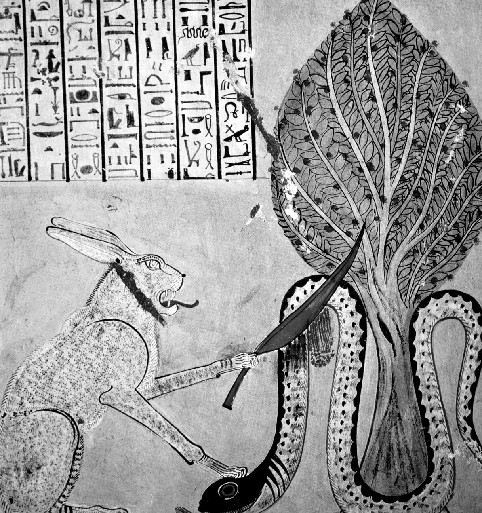 Apofis, la serpiente gigantesca, herida por el dios Ra.