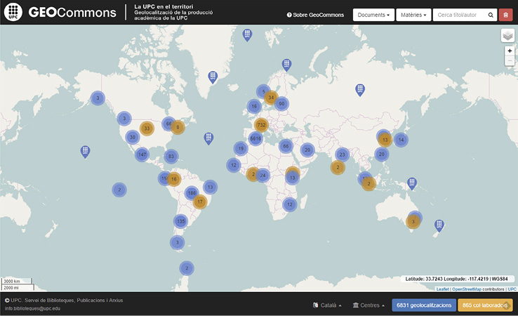• Un Sistema de Información Geográfica (SIG) que permite la navegación por un mapa del mundo donde se encuentran geolocalizados documentos incorporados al depósito institucional UPCommons, así como entidades (universidades, centros de investigación, empresas,…) con quien se ha colaborado para realizar un trabajo específico.