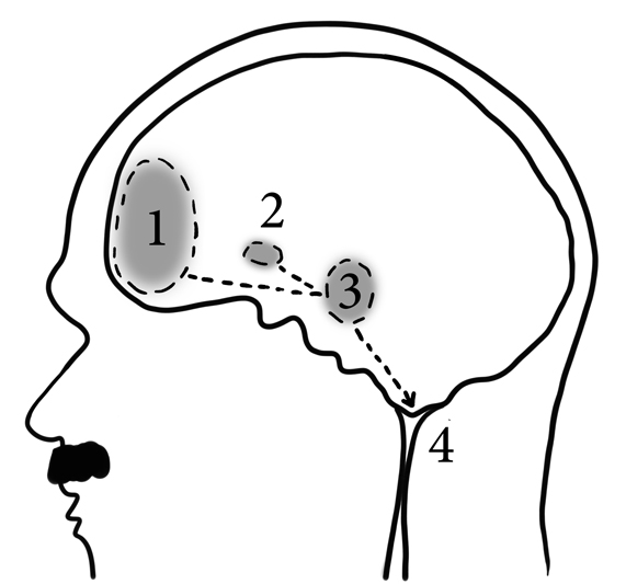 la corteza prefrontal ventromedial (1), la amígdala (2), el tronco cerebral (3)