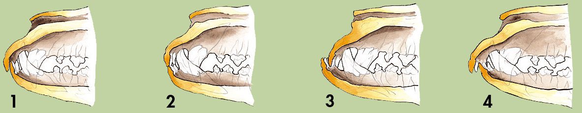 1. cierre en tijera; 2. cierre en tenaza; 3. prognatismo; 4. bragnatismo