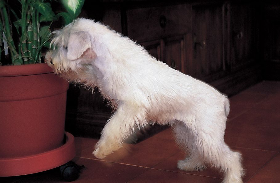 El joven schnauzer exteriorizará rápidamente su temperamento. No conviene dejarlo ir demasiado lejos porque revolucionaría la casa. Desde el principio hay que mostrarle los límites que no se pueden traspasar, atajando con un ¡no! firme las exploraciones excesivas que podrían saldarse con un desastre.