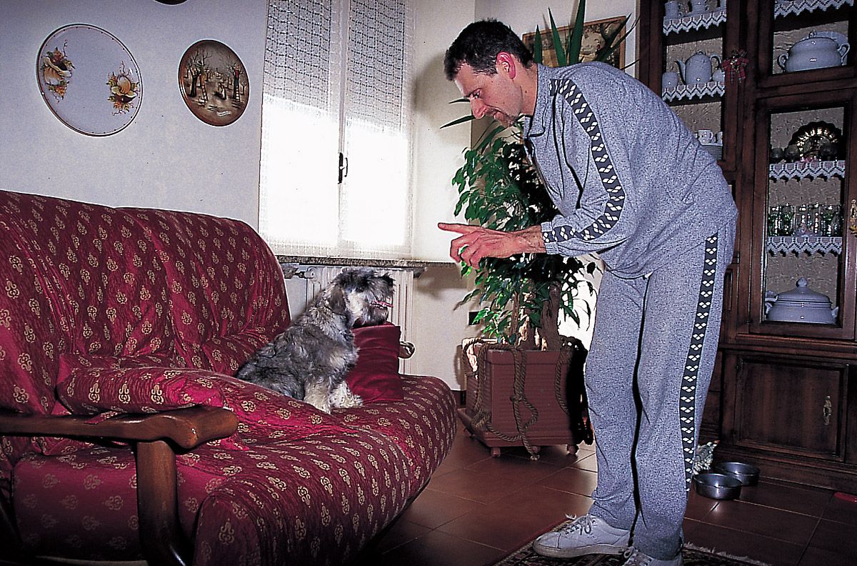 El cachorro capta inmediatamente el tono seco del ¡no! y el gesto de negación con la mano; las primeras veces puede ir acompañado de una ligera sacudida agarrándolo por el cogote (gesto que el cachorro conoce bien, porque es la forma como la madre riñe a sus hijos).