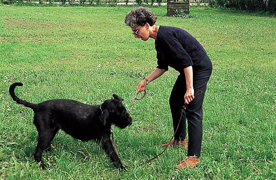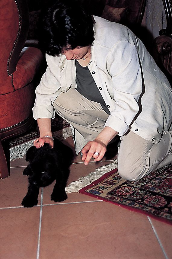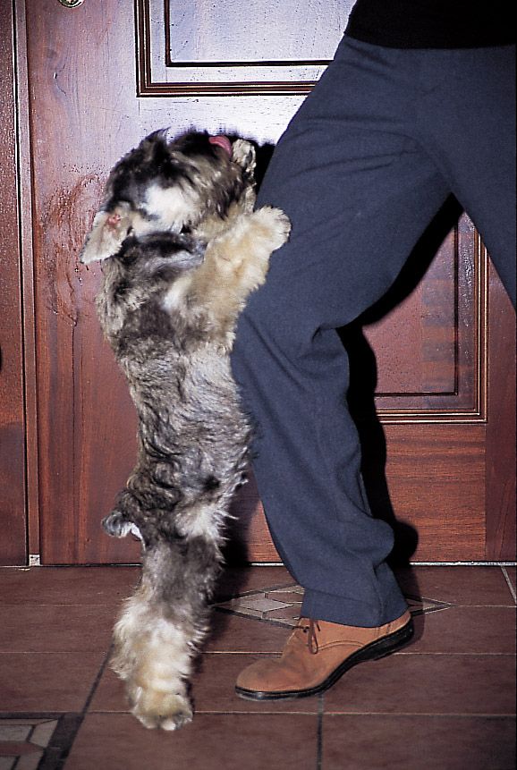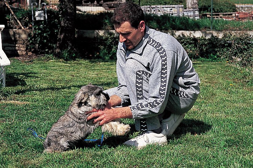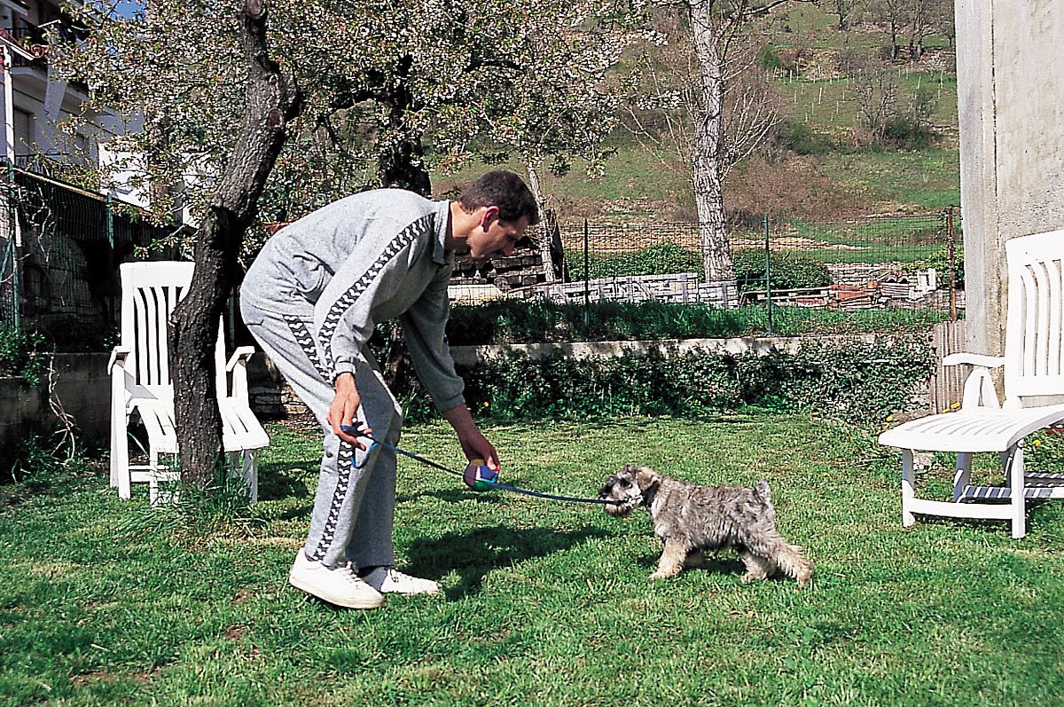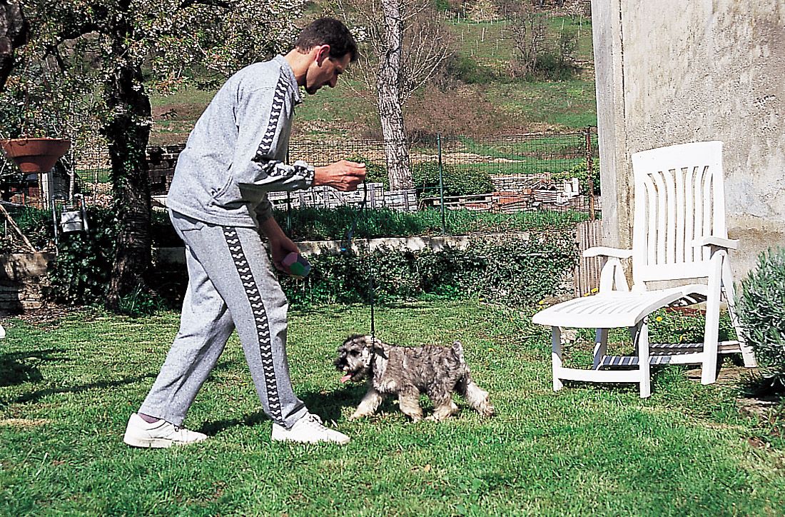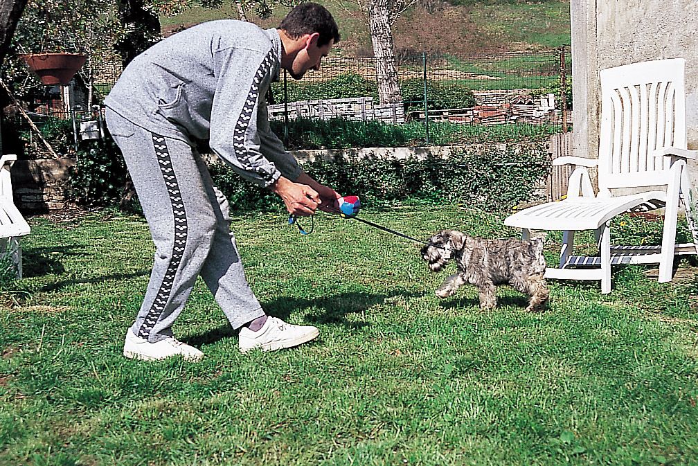 • Excusarnos y hablarle con voz de arrepentimiento si en un lance del juego, por ejemplo, pisamos al cachorro: esta conducta (muy frecuente especialmente entre las mujeres) deteriora el carácter del animal, y le induce a la autoconmiseración cada vez que nota un ligero dolor. El schnauzer no es una figurita de porcelana, sino un animal duro y rústico; si le dedicamos excesivas atenciones por nimiedades, él le encontrará el gusto y se convertirá en una calamidad de perro, incapaz de llevar a cabo ningún tipo de trabajo. Cuando ocurra algún pequeño accidente, proseguiremos el juego como si nada hubiera ocurrido.