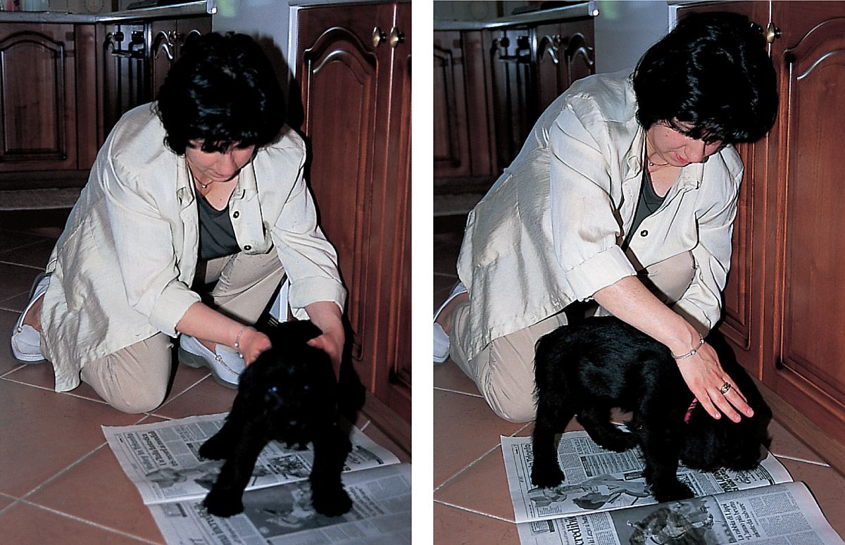 A partir del segundo día de convivencia, cuando el cachorro se haya sobrepuesto al cambio de casa, se le deberán enseñar las normas higiénicas. Si defeca en un lugar incorrecto, lo reñiremos con un ¡no! severo, pero sólo si lo pillamos en el momento de hacerlo. Un minuto de retraso es mucho, demasiado, puesto que el perro no es capaz de relacionar un castigo con una acción incorrecta realizada antes, y no comprendería el motivo de nuestro enfado.