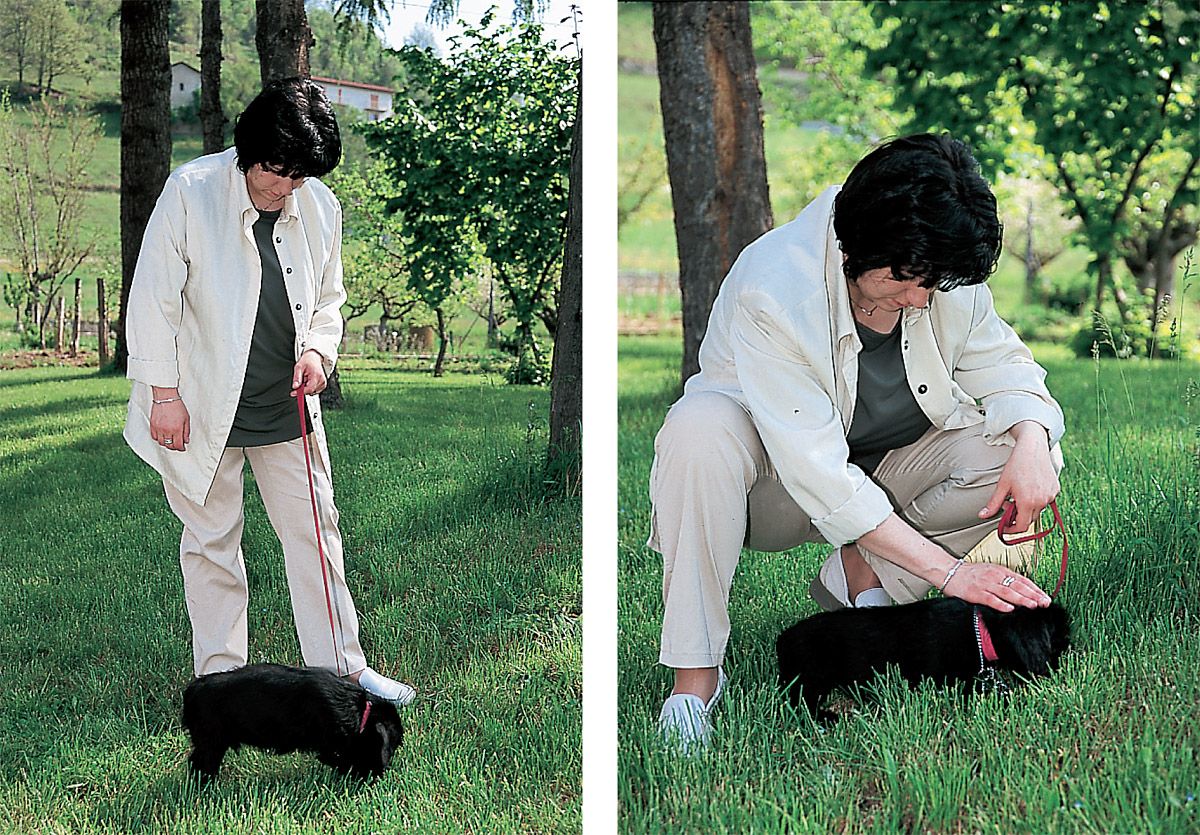 Una de las primeras cosas que debe aprender el cachorro es cómo hacer correctamente las fiestas al dueño. Si adquiere el hábito de saltarle encima, lo seguirá haciendo cuando sea adulto, y un perro de un cierto peso que nos pone las patas en los hombros es bastante menos agradable que un cachorro de dos meses que se apoya tiernamente en nuestras piernas. Saltándonos encima, el cachorro intenta alcanzarnos el rostro: para evitarlo, bastará con agacharse para ponerse a su altura y darle la posibilidad de que exprese todo su afecto.