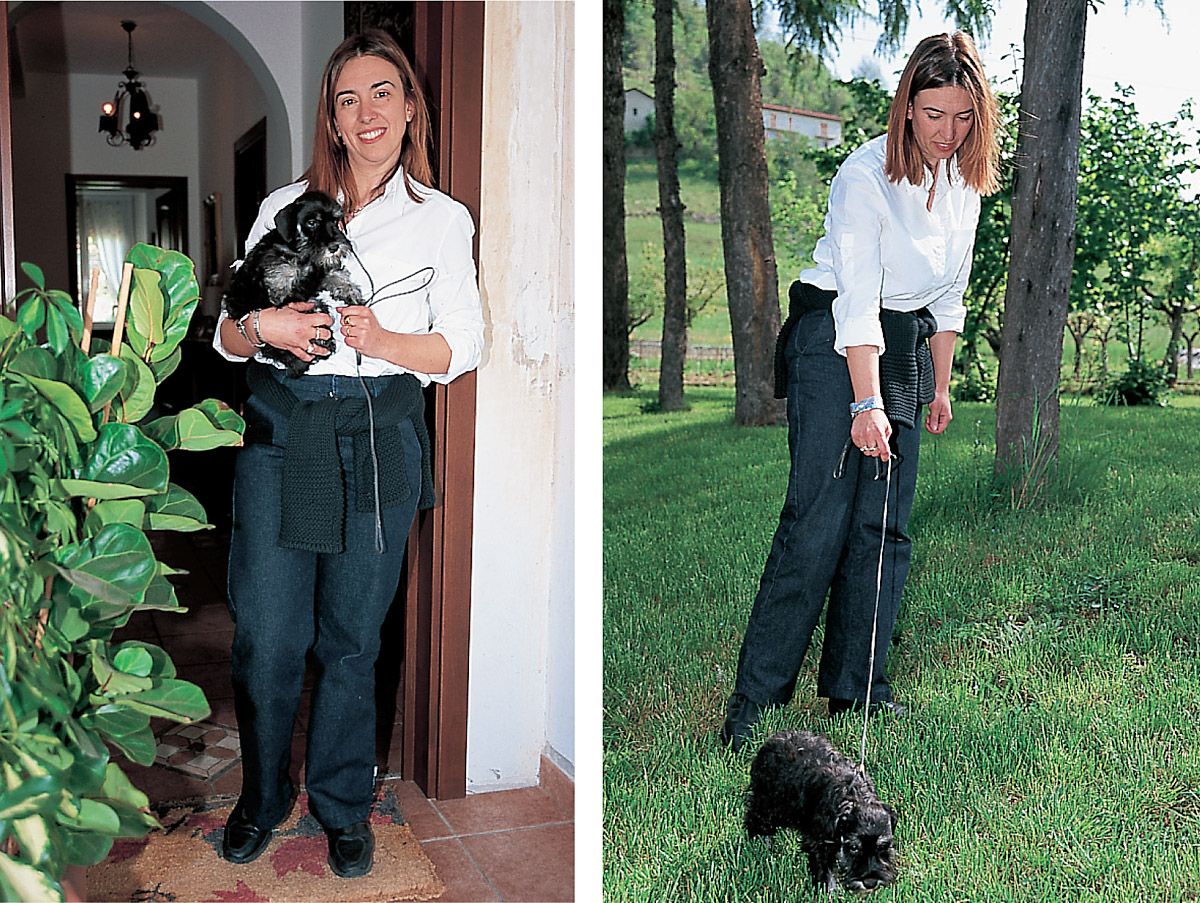 Después de cada comida y al despertarse, llevaremos el cachorro en brazos al jardín. Esperaremos a que haga sus necesidades, sin perderlo de vista. Tan pronto como lo haga, lo felicitaremos calurosamente y lo llevaremos de nuevo a casa con nosotros. Si se da la circunstancia de que ensucia dentro de casa, procederemos igual que en el caso del perro que vive en un piso.