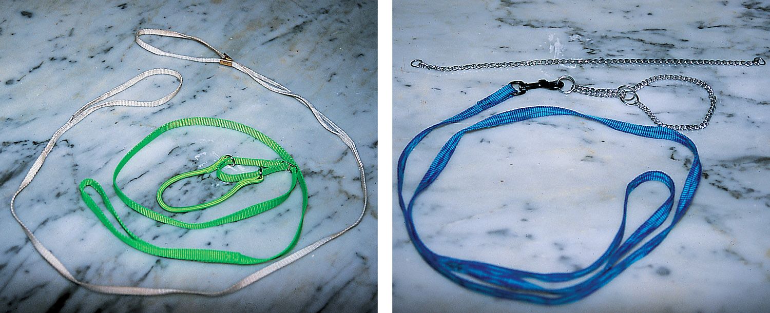 Existe una serie de instrumentos totalmente inadecuados para cualquiera de las tres razas: la correa corta o manilla atada al collar directamente con un mosquetón (porque induce al perro a tirar), el petral (porque le obliga a separar los codos y deforma el movimiento) y la correa con cadena (que puede hacer daño en las manos del dueño o en los dientes del animal al intentar morderla). Nunca dejemos que nos convenzan para comprar estos instrumentos para un schnauzer de compañía, y menos aún para un ejemplar de exposición.