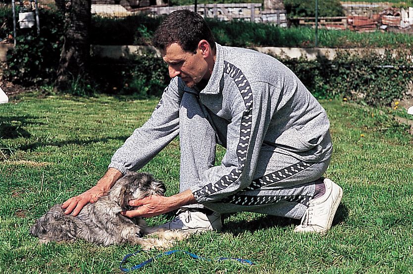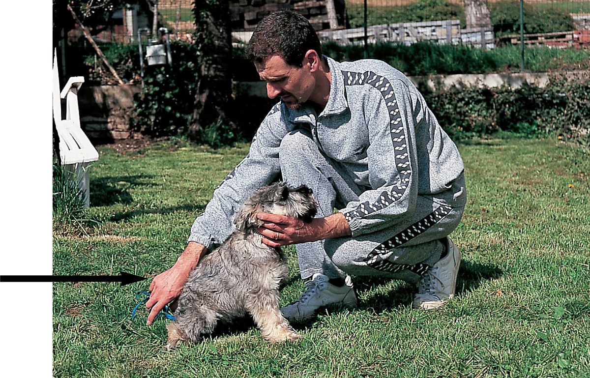 La mano que está en contacto con la grupa no tiene que presionar, sino simplemente acompañar. La presión originaría una resistencia en sentido opuesto por parte del cachorro