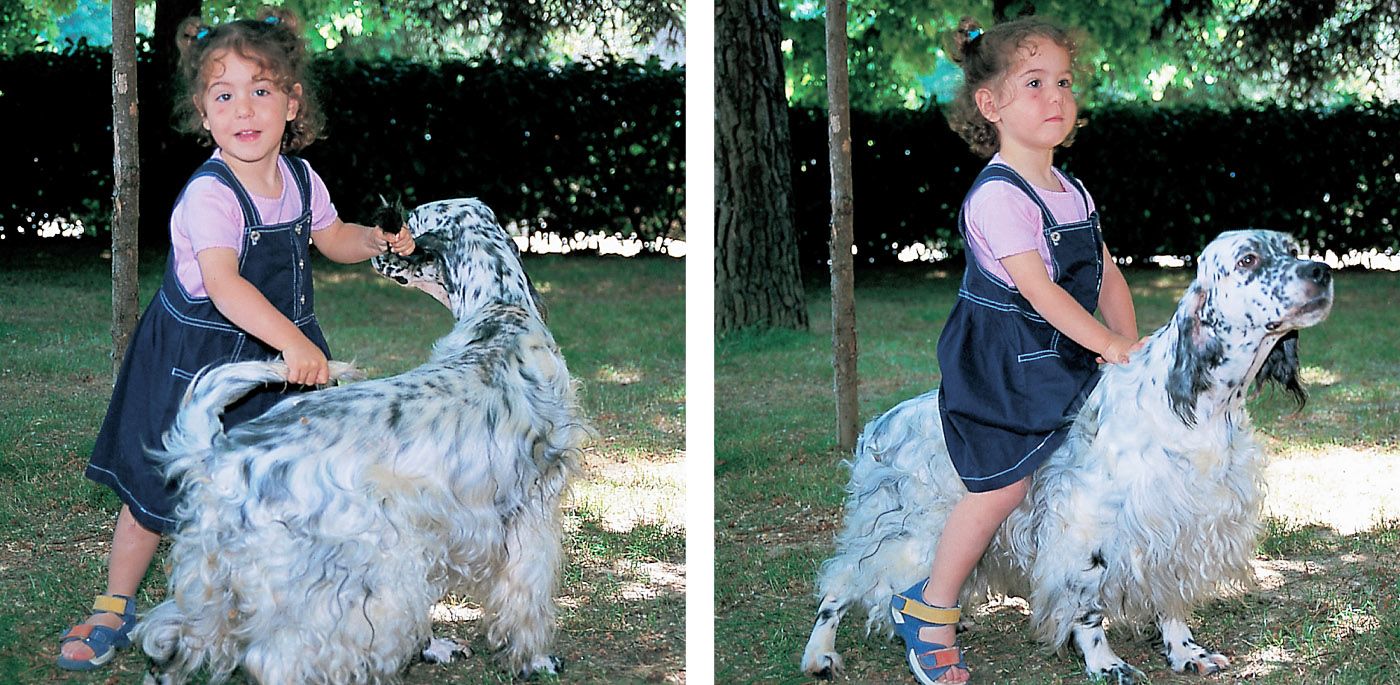 1. La hembra setter es muy afectuosa, más independiente que el macho, pero también más sumisa y, por esta razón, más capaz de adaptarse al ritmo de vida de una familia moderna. Físicamente es más menuda y tiene el pelo menos vistoso. En pareja, acepta sin problemas que el macho «crea» que es el líder. El principal problema son los periodos de celo: dos veces al año sufre pérdidas de sangre bastante abundantes, que quedan compensadas con la satisfacción de hacerla procrear.