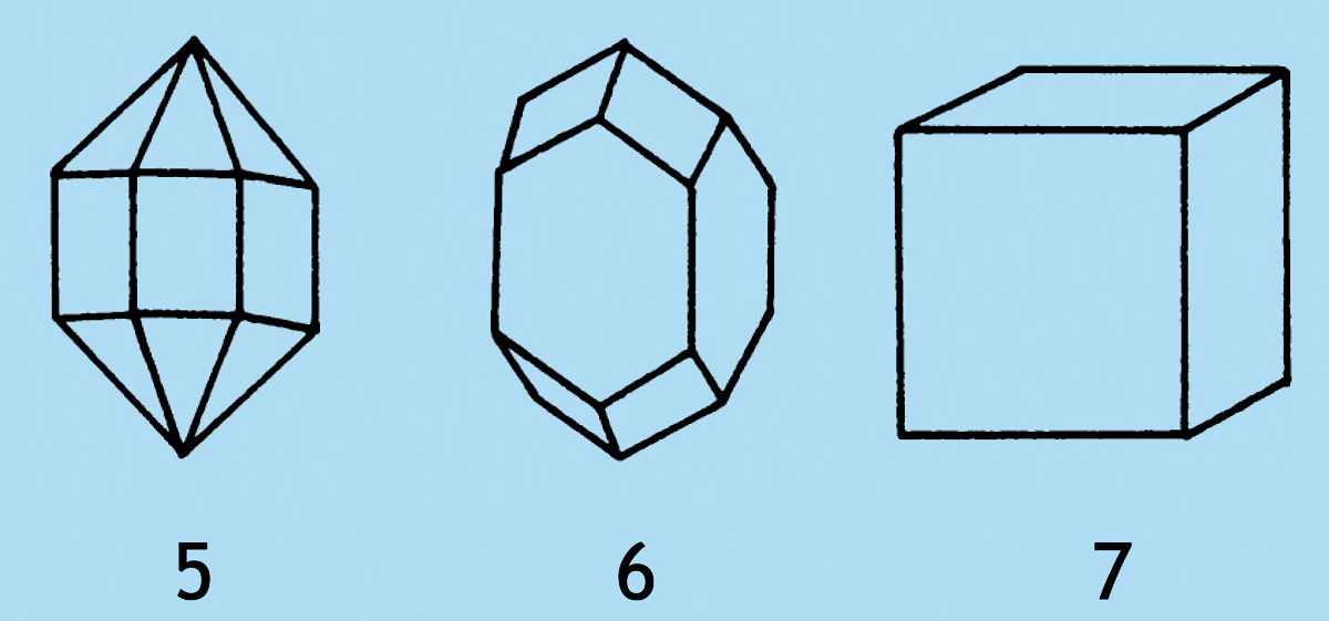 5. trigonal o romboédrico; 6. tetragonal; 7. monométrico o cúbico