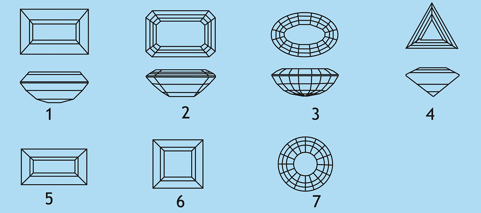 1. rectangular; 2. rectangular escalonada (en esmeralda); 3. oval; 4. triangular; 5. baguette; 6. cuadrada; 7. redonda