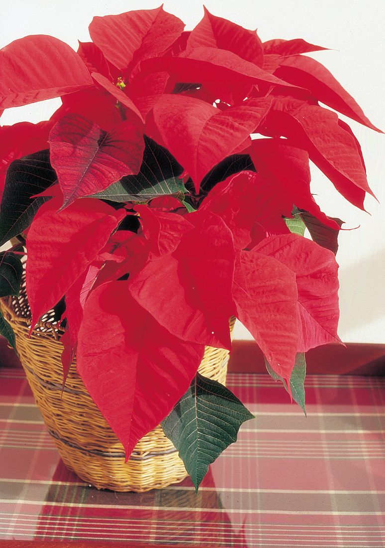 Las brácteas de color rojo que acompañan las flores de poinsetia (Euphorbia pulcherrima) la convierten en un adorno navideño clásico