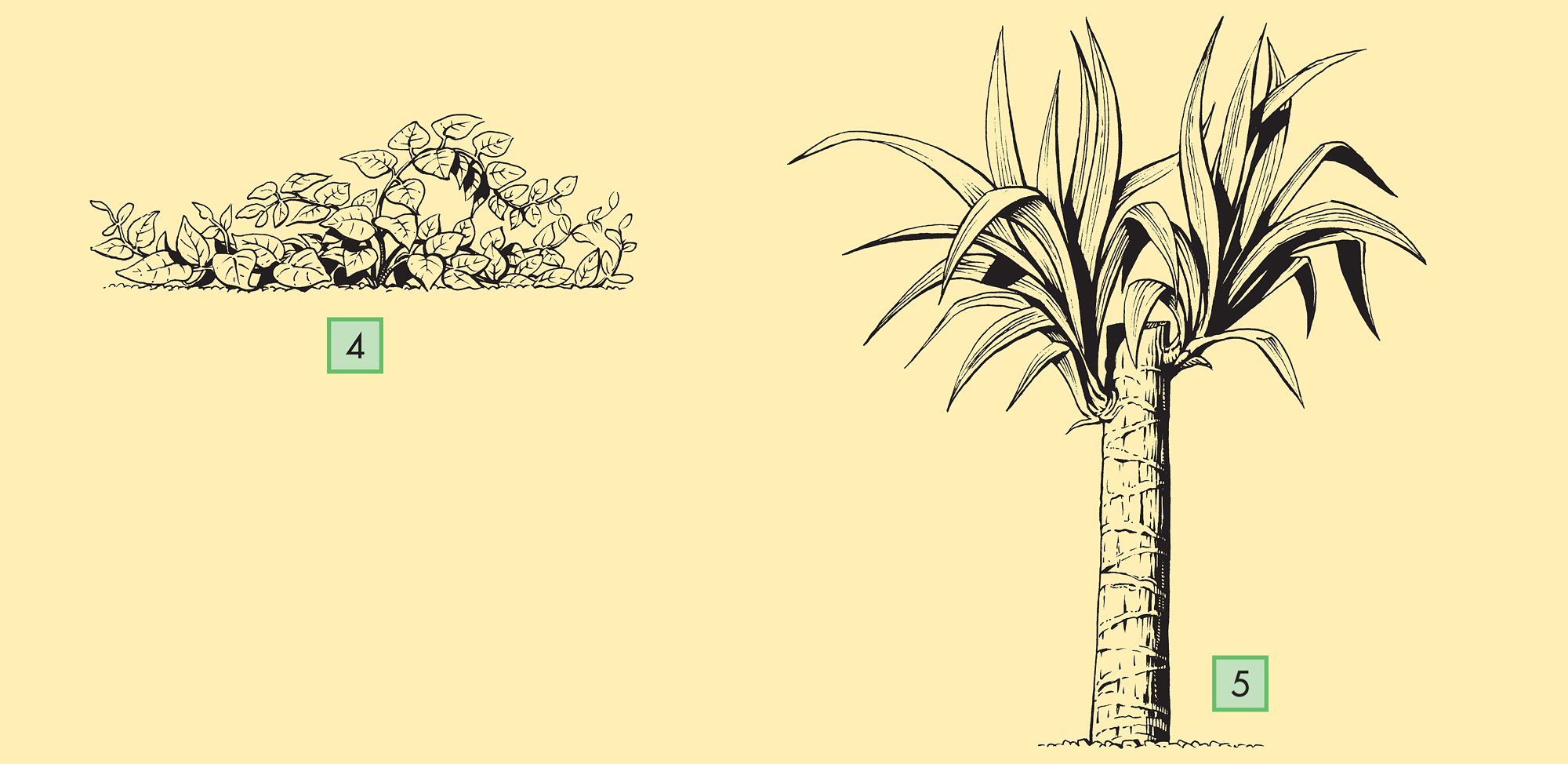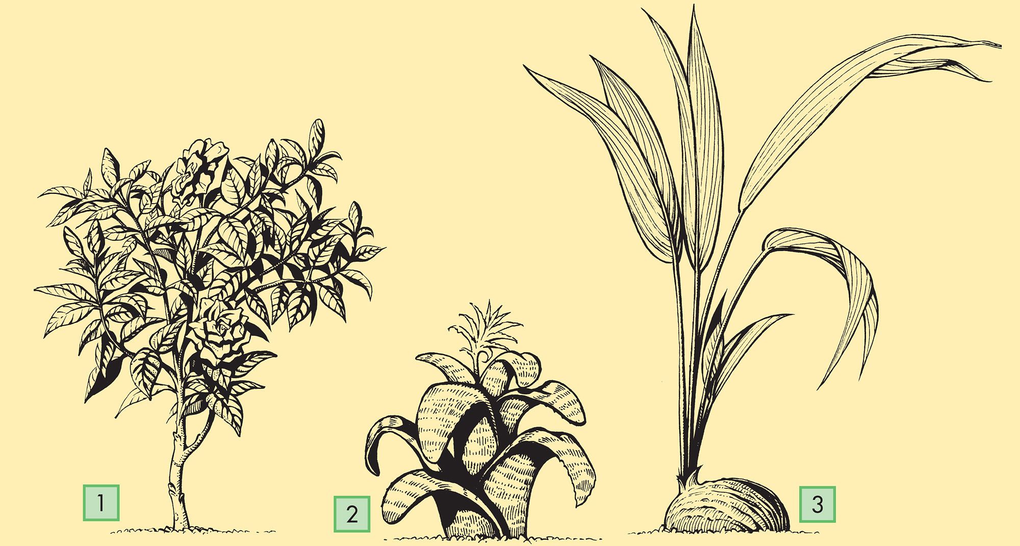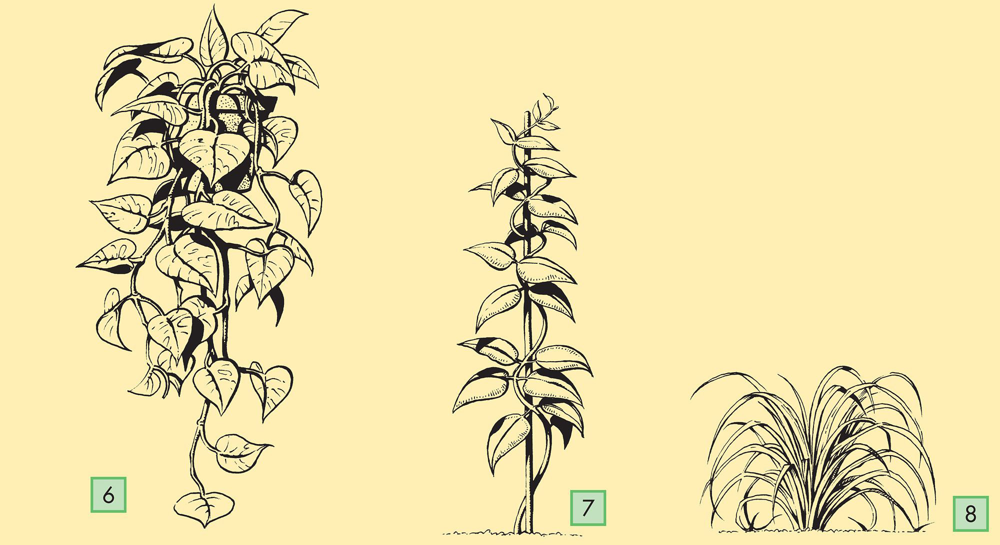 Se pueden ver distintas formas de plantas de interior: 1. arbustiva (gardenia); 2. roseta (aechmea); 3. arqueada (cocotero); 4. rastrera (ficus rastrero); 5. erguida (yuca); 6. colgante (poto); 7. trepadora (flor de cera), y 8. llorona (clorofito)