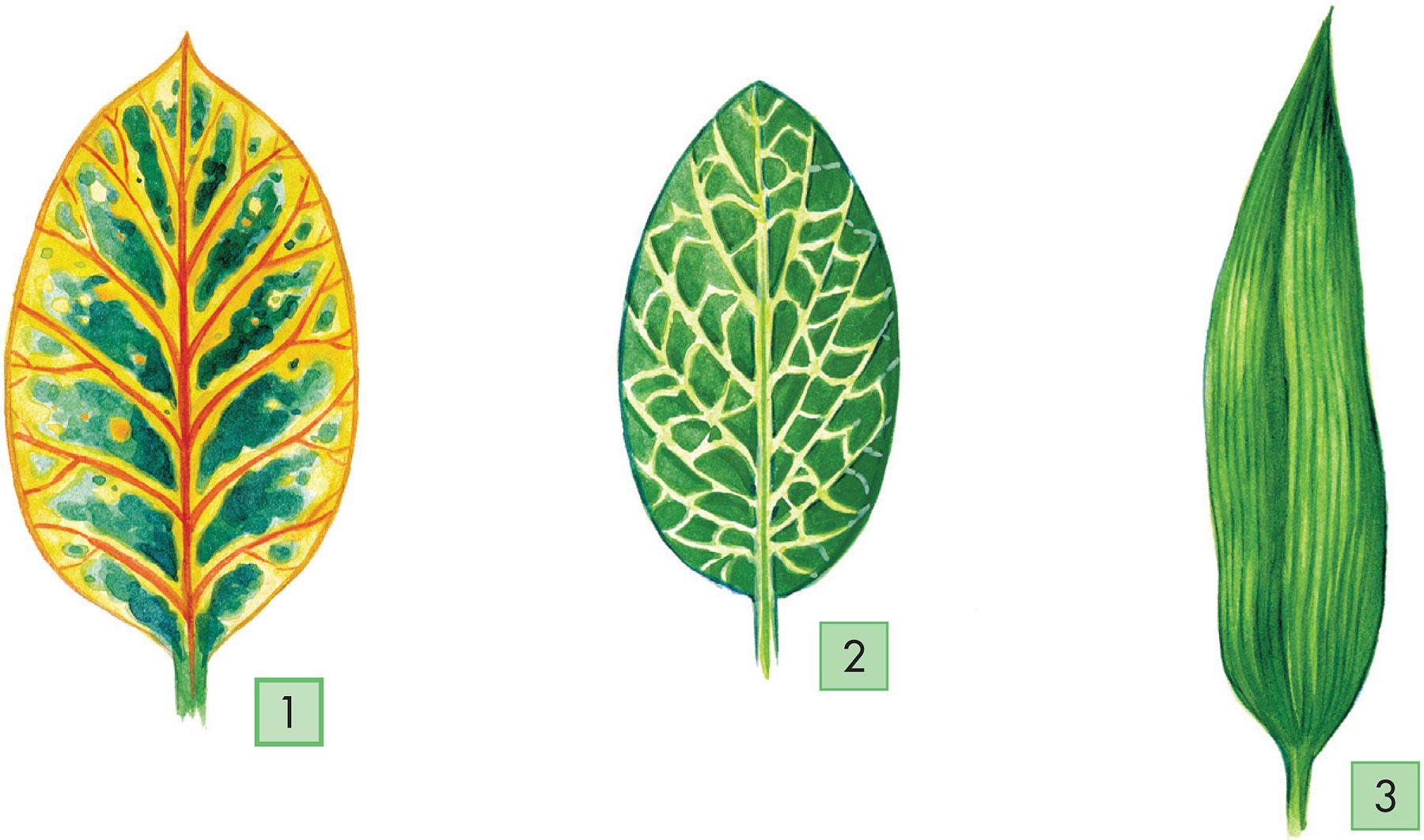 1. partida-peciolada (Codiaeum variegatum); 2. retinervia (Fittonia verschaffeltii); 3. paralelinervia (Aspidistra elatior)