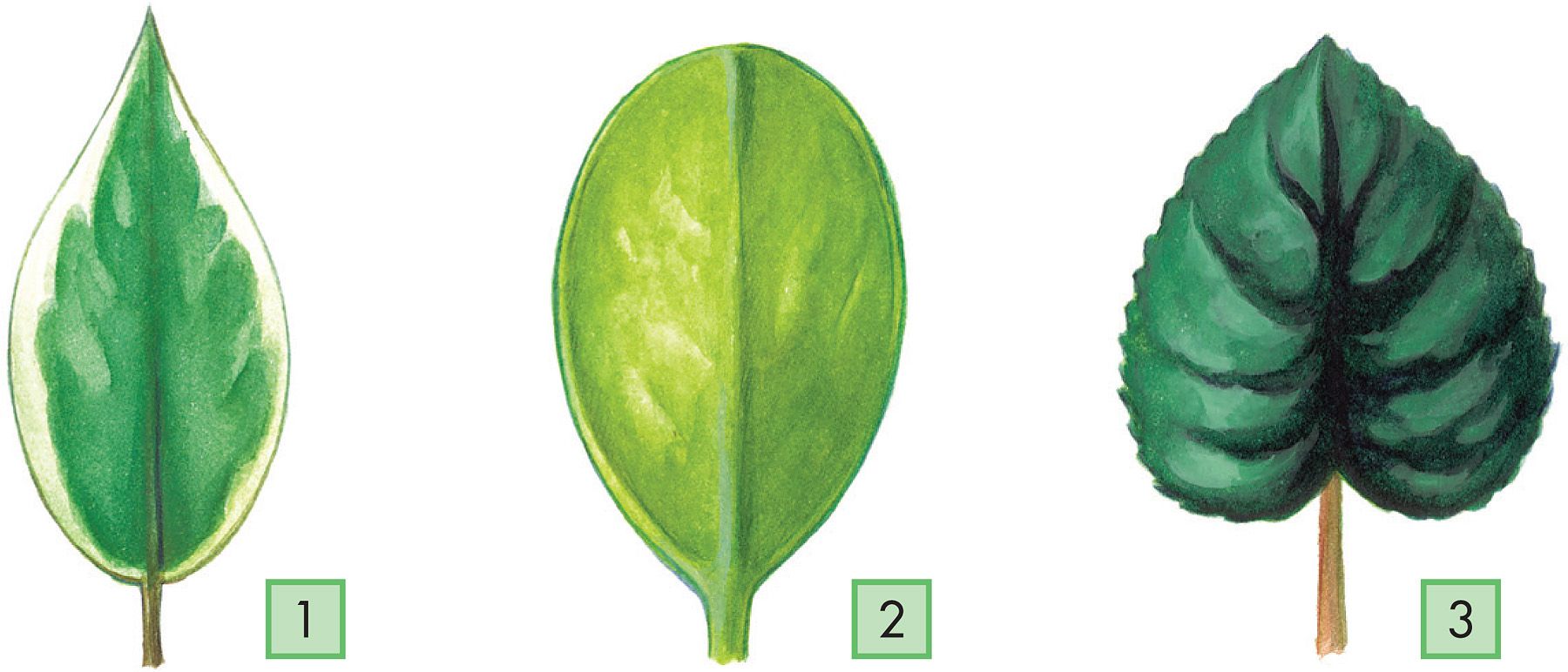 1. entero (Aglaonema tewbii); 2. dentado (Cissus rhombifolia); 3. serrado (Plectranthus nummularius)