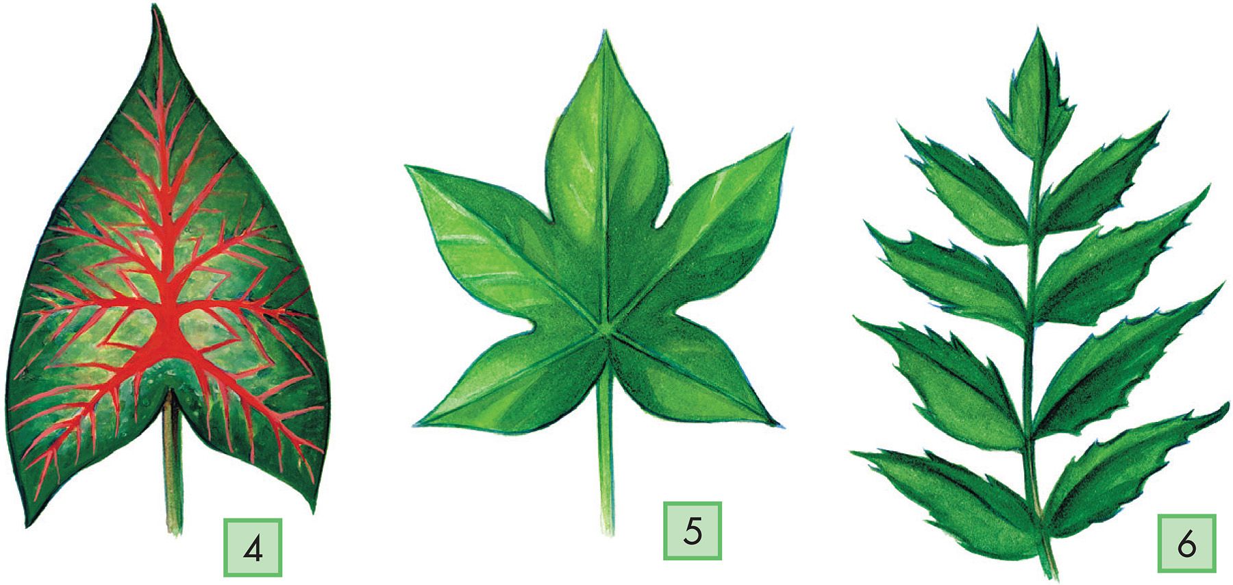 1. lanceoladas (Hoya carnosa); 2. aovadas (Crassula arborescens); 3. cordiformes (Saintpaulia ionantha); 4. sagitadas (Caladium bicolor); 5. palmeadas (Fatsia japonica); 6. compuestas imparipinnadas (Polypodium sp.)