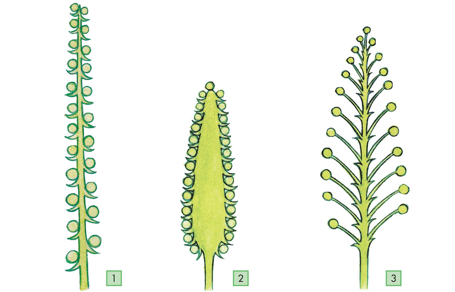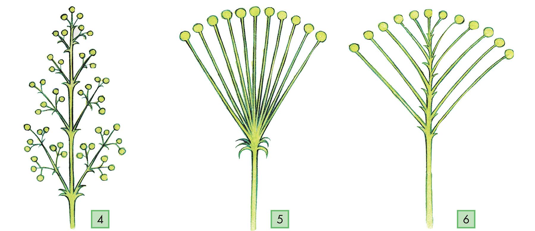 1. espiga; 2. espádice; 3. racimo; 4. panícula; 5. umbela; 6. corimbo