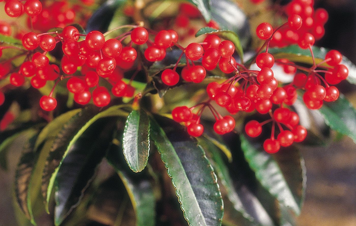 Los frutos de ardisia (Ardisia crispa) permanecen en la planta durante varios meses, y son más decorativos que las propias flores
