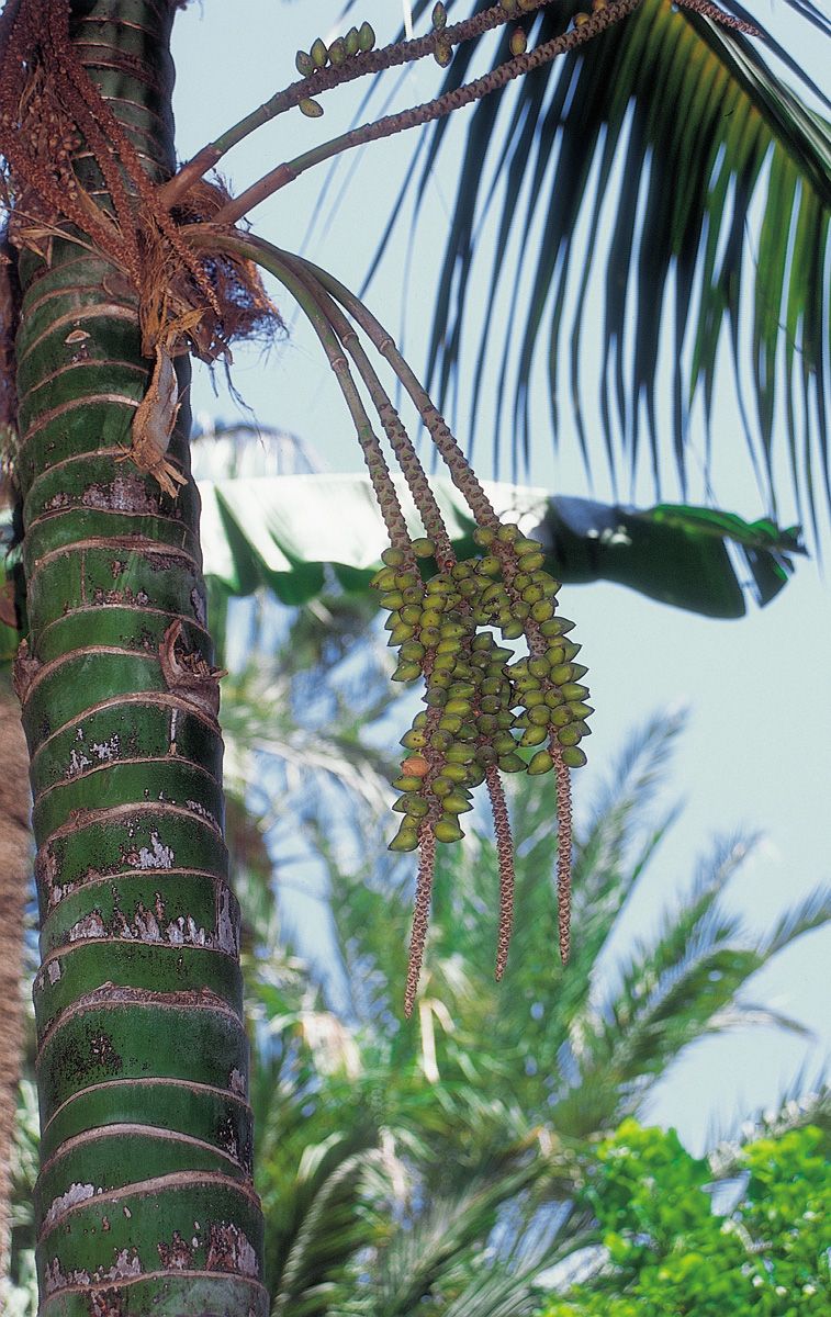 Hay especies, como la kentia (Howea forsteriana), que sólo florecen y fructifican si disponen de unas condiciones de cultivo especiales (la de la imagen se halla en un jardín especializado en palmeras, el Huerto del Cura, en Elche)