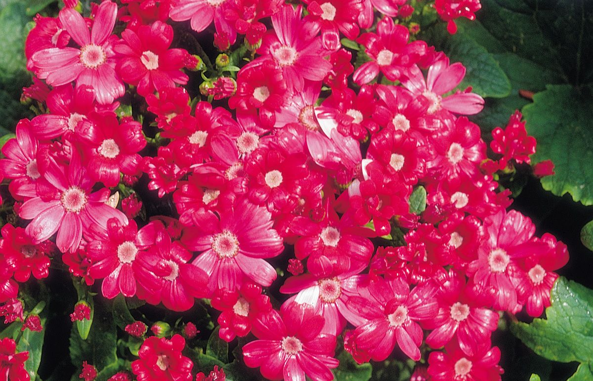 La cineraria de florista Senecio × hybridus presenta flores de colores muy variados, en un solo tono o bicolores