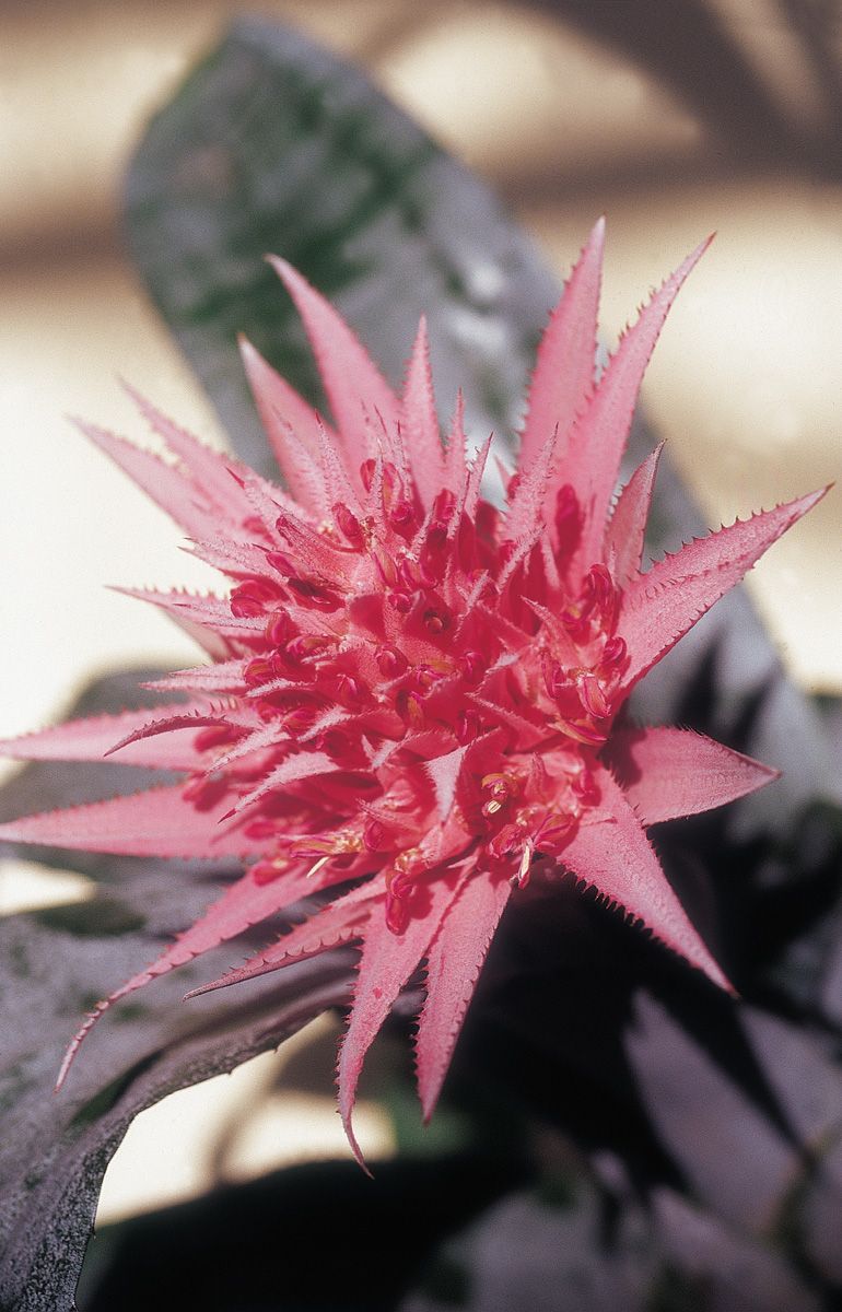 Todas las bromeliáceas tienen unas flores curiosas que emergen del centro de la roseta de hojas, y Aechmea fasciata es una de las más populares