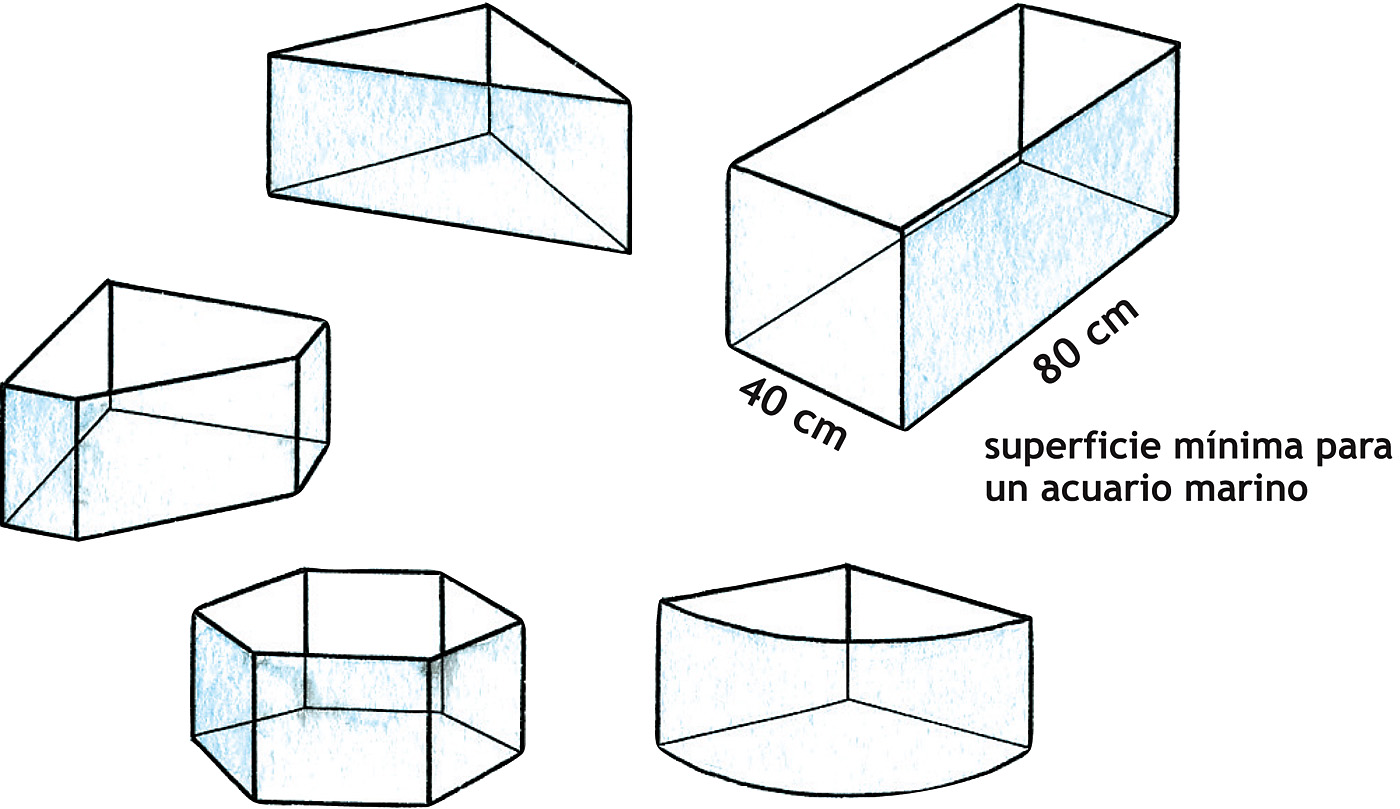 En la actualidad, la tecnología al servicio de la acuariofilia permite satisfacer las exigencias estéticas más imaginativas en relación con la forma del acuario: acuarios de sección triangular, trapezoide o cuadrada, cilíndrica o con el cristal anterior convexo, se encuentran disponibles en producciones industriales y artesanales. No obstante, y a pesar de la gran cantidad de modelos existentes, el acuario rectangular continúa siendo insuperable y ofreciendo, sin lugar a dudas, la mejor relación entre funcionalidad y estética. El acuario rectangular es el mejor, es el más extendido y, desde luego, es el más recomendable para un principiante. En este tipo de acuario, la relación ideal entre las tres dimensiones (longitud-profundidad-altura) debería de ser de 2-1-1. Por ejemplo, a una longitud de un metro le debería corresponder una profundidad y una altura de medio metro cada una. Sin embargo, y por motivos puramente estéticos, a menudo se prefiere aumentar en mayor medida la altura en detrimento de la profundidad, un error que, en los casos más extremos (acuarios con alturas casi iguales a la longitud y más del doble de la profundidad), puede costar muy caro. De hecho, en tales acuarios resulta muy difícil mantener de manera uniforme ciertos parámetros ambientales muy importantes, como la oxigenación o la temperatura, porque existe una tendencia a la estratificación; la iluminación en los estratos más bajos es muy difícil y, además, las operaciones de mantenimiento más simples, como desplazar un objeto de la decoración o pescar un pez, son realmente incómodas. El caso contrario, una mayor profundidad respecto a la altura comporta sólo beneficios: la circulación del agua es más fácil y permite uniformar todos los parámetros ambientales, se ilumina de manera más eficaz y las operaciones de mantenimiento son más sencillas.