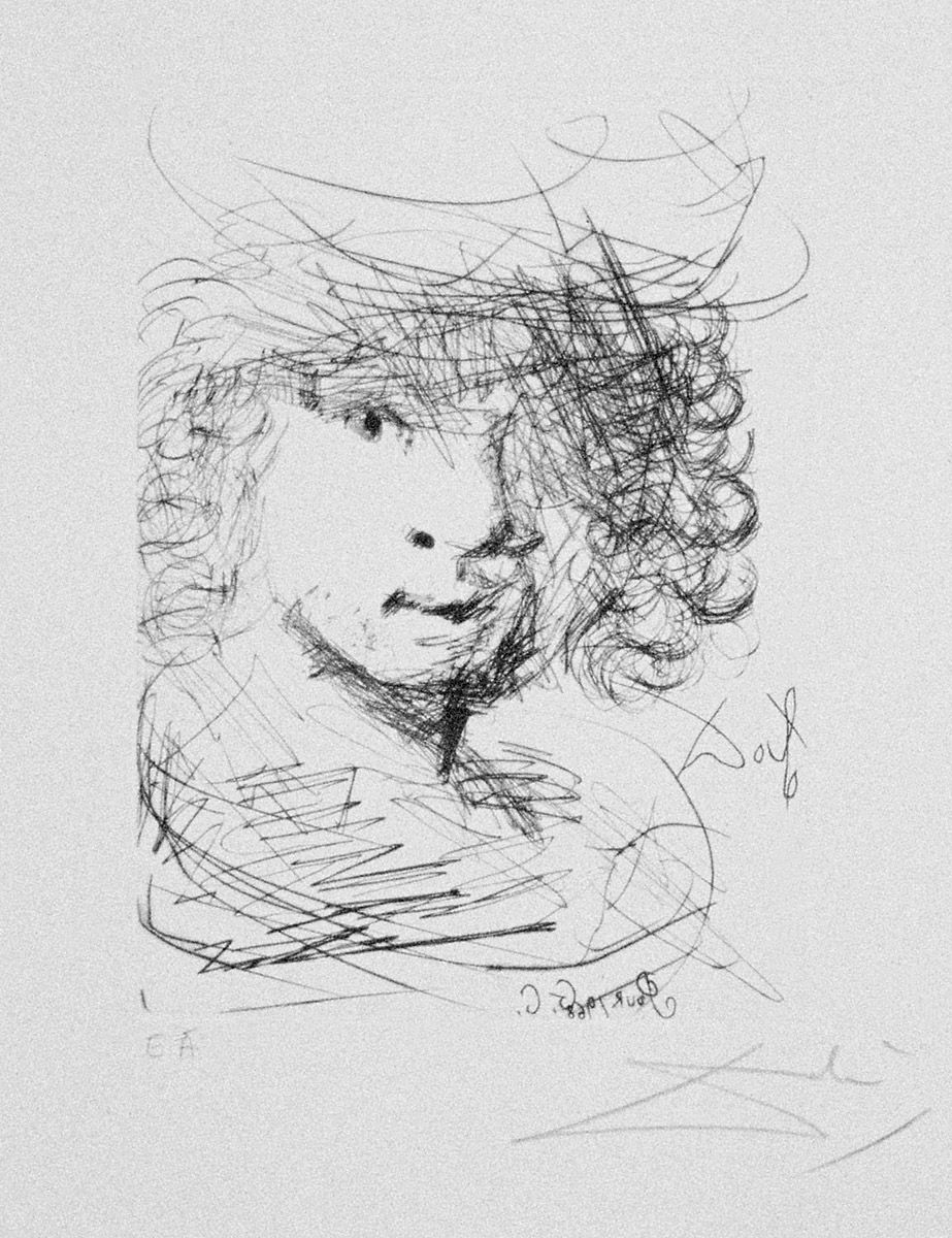 Retrato de Rembrandt, punta seca original de Salvador Dalí, Éditions W.U.C.U.A. (Ref. n.º 292, catálogo Prestel © Demart Pro Arte B. V. Ginebra - ADAGP, París, 1996)