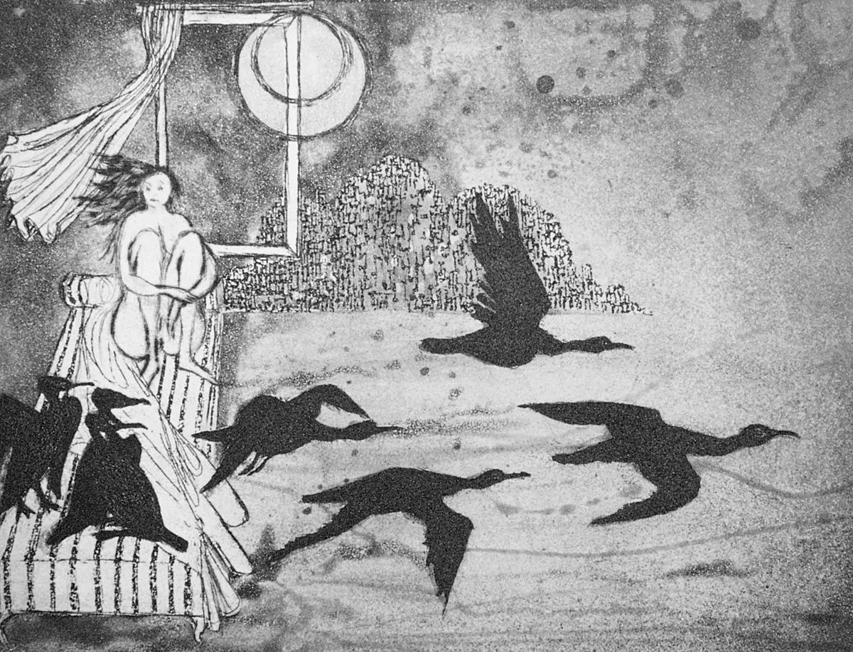 Jeune femme aux cormorans, aguafuerte y aguatinta de Lars Bo, Arenella Édition, 1973