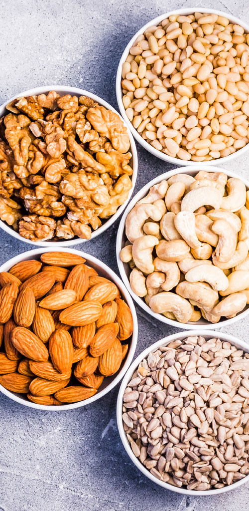 Germen de trigo, almendra, albaricoque, pistacho, andiroba, onagra, borraja, moringa, rosa mosqueta, cártamo, cáñamo, girasol, cacahuete, colza, soja, cada, nuez, lino, ricino, pepitas de uva, marula, cho-cho, cundiamor de China, trébol malayo, nuez de Brasil, nuez pacana, nuez de macadamia, pistacho. |