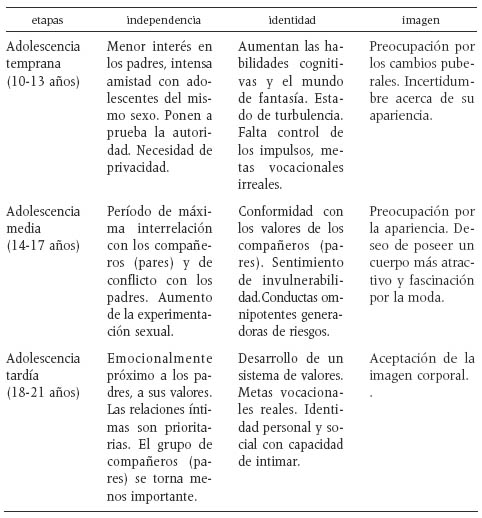 Por último, en la adolescencia tardía, de los 18 a los 21 años, es cuando surgen relaciones interpersonales estables, con aproximación física y, a veces, contacto sexual. Tanto en el plano biológico como en el psicológico, existe en esta fase una mayor capacidad de compromiso (Erikson hablaba de la «capacidad de intimidad» como logro propio de esta etapa). Otro logro paralelo es el de la identidad, que implica una autoimagen estable. En el plano cognitivo, la capacidad de abstraer permite planificar el futuro y preocuparse por el estudio, el trabajo, su vida en pareja, etc. La relación con la familia a veces vuelve a ser importante, con una visión menos crítica y una actitud menos beligerante hacia los padres (tabla 1).