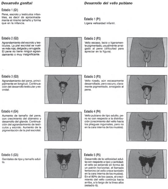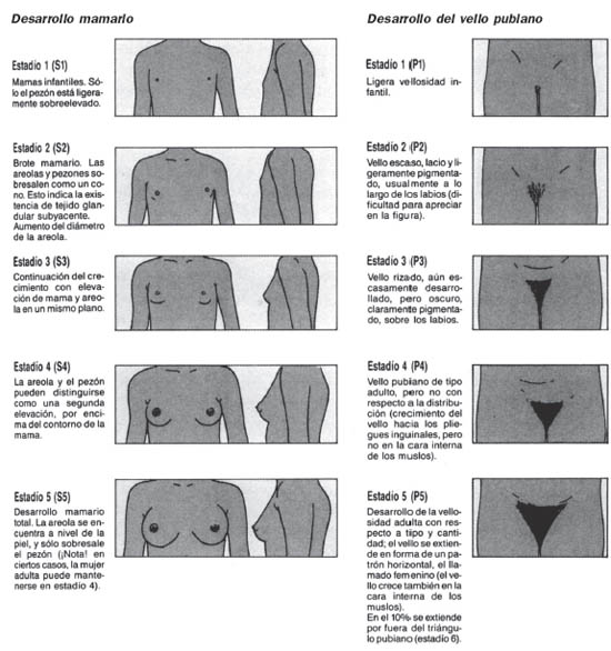 En la adolescencia, la curva de crecimiento necesita ser complementada con la evaluación de la maduración sexual, pues de esta manera el especialista podrá establecer el pico de crecimiento, el desarrollo reproductivo y el final del crecimiento. Así, cuando el médico examina a su paciente adolescente, utiliza dos tipos de observaciones para estimar los estadios de maduración (sexual) de Tanner: en la niña, el desarrollo de la mama y el vello pubiano, y en el varón, el desarrollo de los testículos y también el vello pubiano (ver figs. 1 y 2).