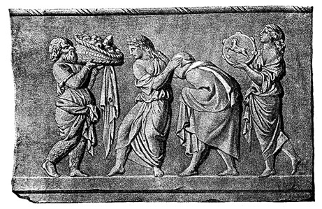 Relieve romano del siglo I en el que se ve a un candidato que es conducido a una ceremonia de iniciación.